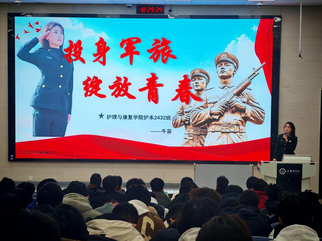 2025年12月10日,护理与康复学院开展线下征兵宣讲会。退伍大学生牛苗、李辙化身“宣讲员”,既分享军旅生活感悟,又进行专业细致的政策解读,有效提升了同学们对征兵政策的知晓率,极大激发了学院青年学子的参军热情,为2026年上半年征兵工作顺利开展奠定坚实基础。