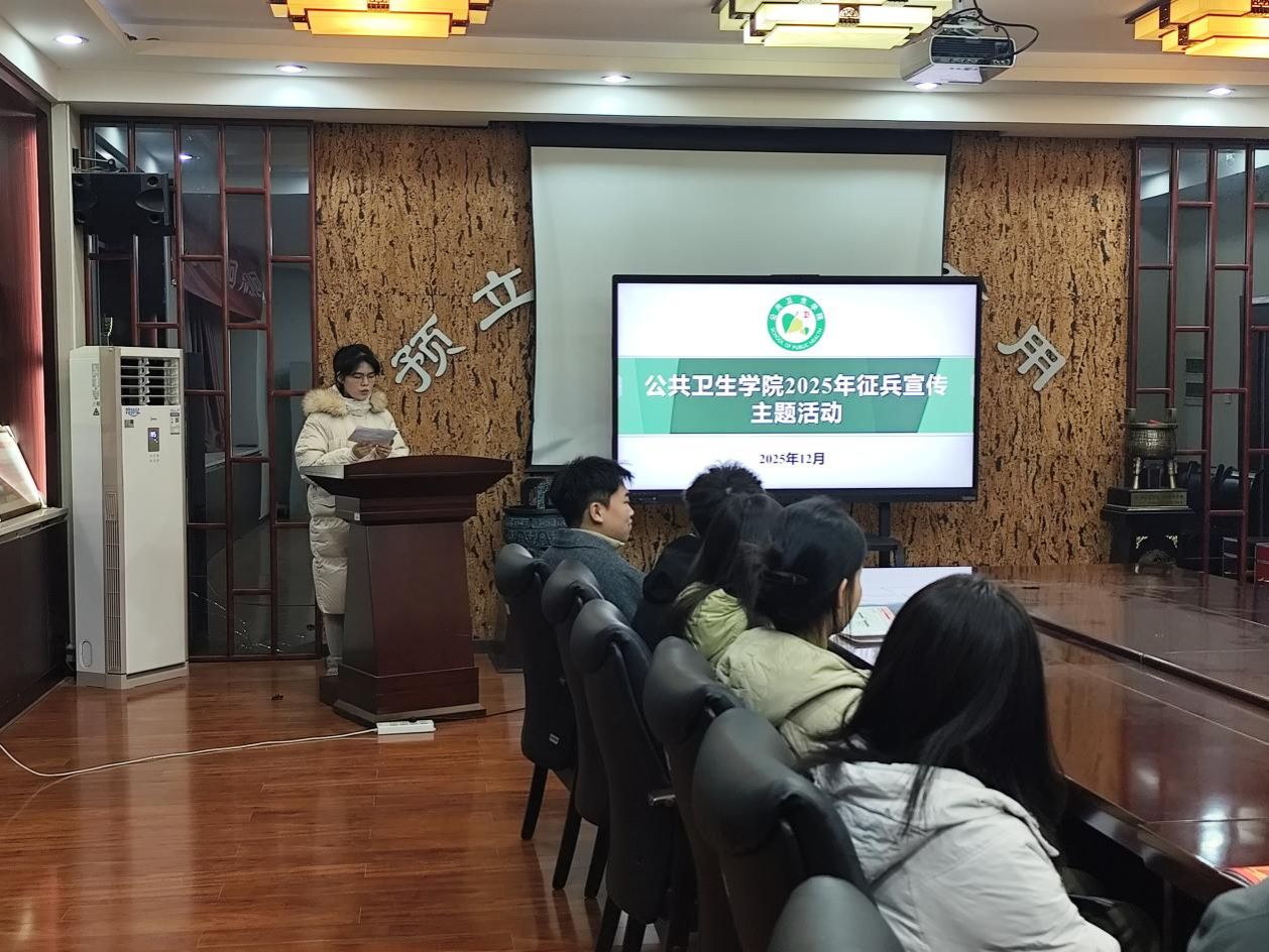 2025年12月公共卫生学院集中开展2026年上半年征兵宣讲活动。为团学青年代表组织集中宣传,邀请退役复学大学生肖淑雯深入解读征兵政策;同时动员退役复学大学生林瑞愉走访30余间学生宿舍开展宣讲,征兵专干张嘉旭同步开展专门宣传活动,多维度增进学生对征兵政策的了解,激发参军报国热情。