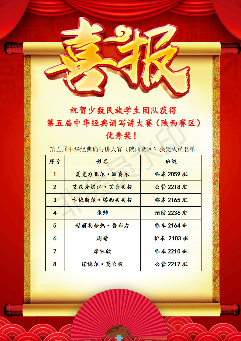 近日,陕西省办公厅公布了2023年第五届中华经典诵写讲大赛(陕西赛区)评选结果,我校民族学生团队携拍摄作品《礼赞新时代、奋斗正青春》喜获大学生组优秀奖!