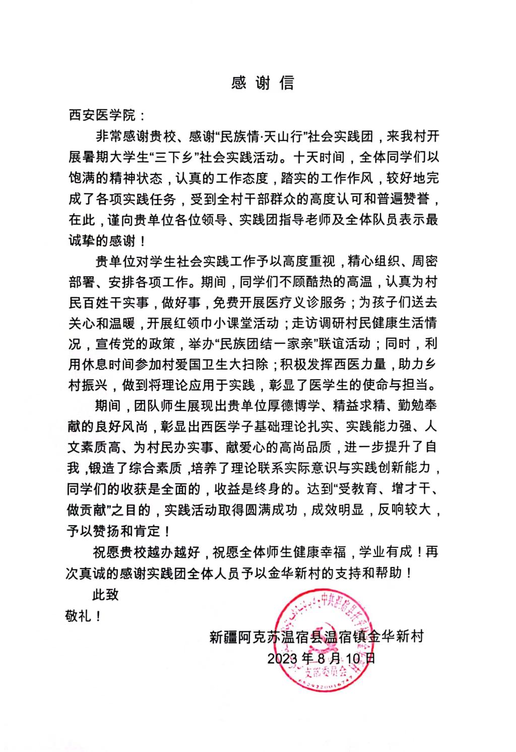 近日,我校收到来自新疆阿克苏温宿县金华新村两委会发来的感谢信,对“民族情·天山行”暑期社会实践团,尽心尽力为金华新村各民族群众服务、助力乡村发展与振兴做出的贡献予以真挚的感谢!全文如下: