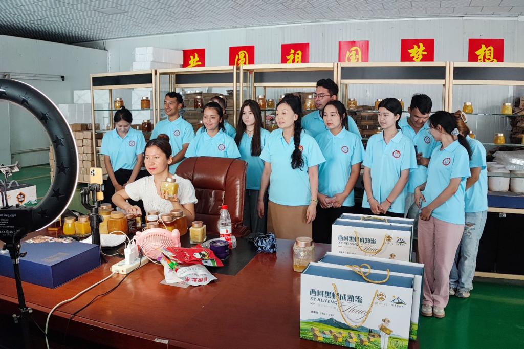 参观密姐黑蜂蜂蜜厂,同学们被宽大的厂房、先进的设备、一排排整洁摆放的货架,一堆堆待发往全国各地的货品所震撼,大家好奇的询问着产品的性能和功效,价格和销量。看到直播间里导购员正在做产品直播推广,团队师生立马整齐的站在导购员身后,进入直播间,向网上的顾客做推广宣传,为家乡产业代言,为乡村振兴助力。
