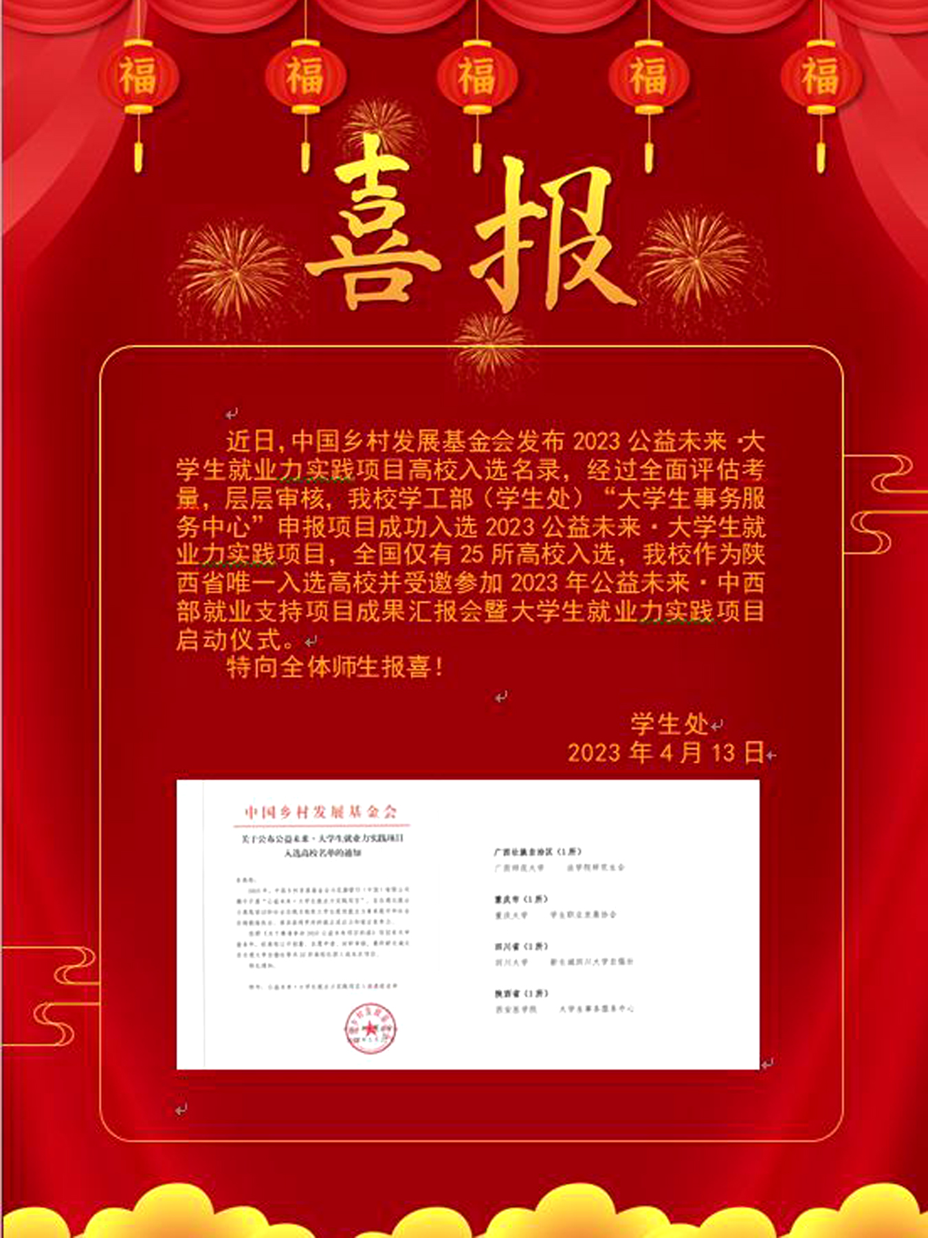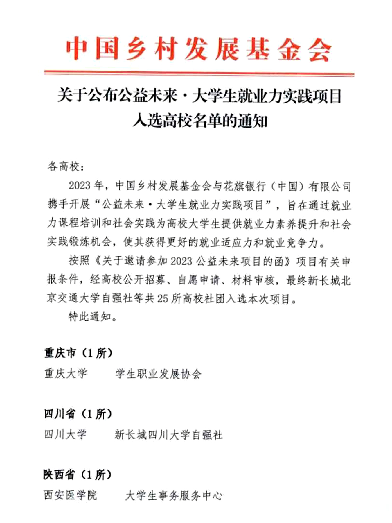 近日,中国乡村发展基金会发布2023公益未来·大学生就业力实践项目高校入选名录,经过全面评估考量,层层审核,我校学工部(学生处)“学生组织大学生事务服务中心”申报项目成功入选2023公益未来·大学生就业力实践项目,全国仅有25所高校入选,我校作为陕西省唯一入选高校并受邀参加2023年公益未来·中西部就业支持项目成果汇报会暨大学生就业力实践项目启动仪式。