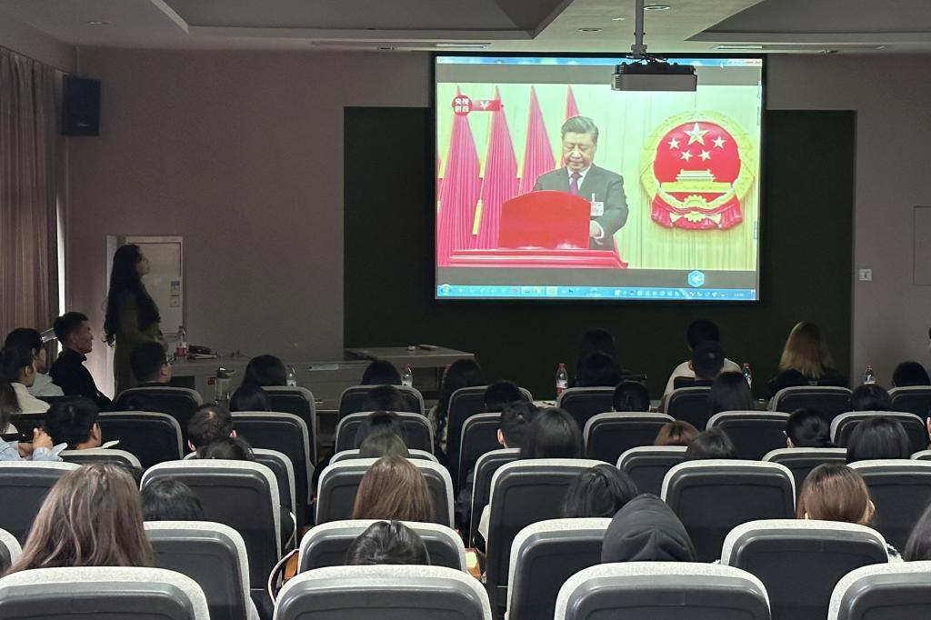 安顺凤老师首先向大家简单介绍了开展此次活动的目的和意义,并就学习贯彻全国两会精神的重要性、全国两会会议内容等知识要点进行讲解。随后,大家一起学习观看了全国两会专题片《春天的盛会》。看到习近平总书记全票当选国家主席、中央军委主席,以及习近平主席进行宪法宣誓那庄严神圣、激荡人心的场景,同学们激动不已,非常的振奋!
