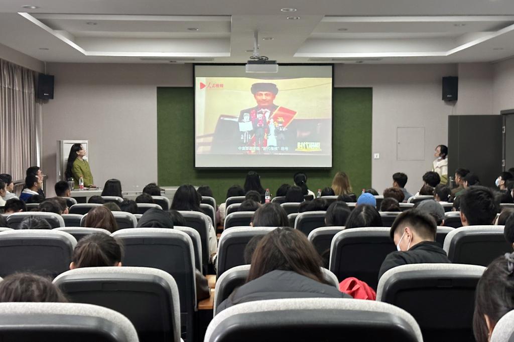 同学们认真观看时代楷模拉齐尼·巴依卡感人事迹
