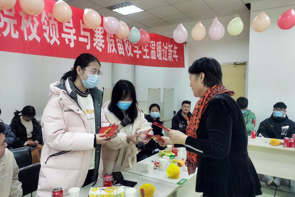 学工部部长、学生处处长靳红樱为学生发放新年红包