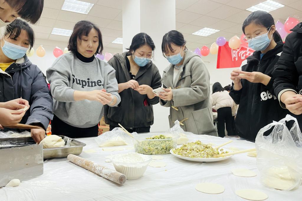 学生处副处长昝倩与学生包饺子并介绍饺子的历史渊源