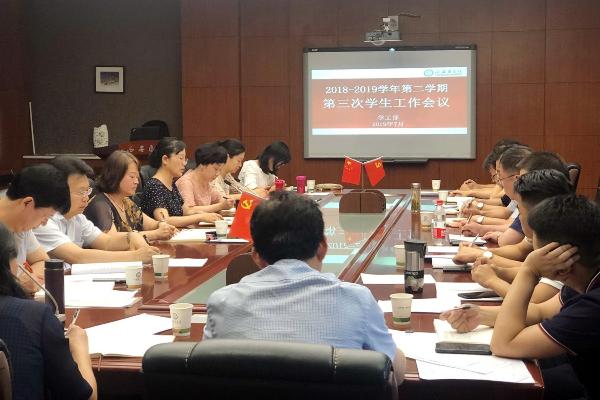 7月3日下午,本学期第三次学生工作会议在马克思主义学院会议室召开。校党委副书记熊冬梅出席会议并作讲话。校团委、各学院党总支书记(副书记)、第一临床医学院、第二临床医学院党委书记、学生科长、团总支书记、学工部全体人员参加了会议。会议由学工部部长、学生处处长靳红樱主持。