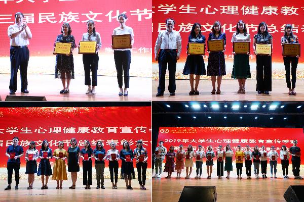 大会第二项表彰先进。陕西省政法委副书记杨渭锋、陕西高校心理素质教育研究会会长郑林科、学工部部长靳红樱分别对获得2019年心理健康先进个人、优秀心理委员、心理健康教育先进单位及第三届民族文化节先进单位的获奖集体和个人颁发了奖牌和奖状。
