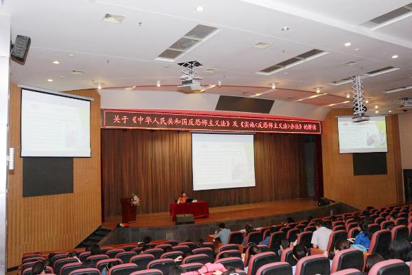 为深入学习贯彻《中华人民共和国反恐怖主义法》,引导广大师生充分认识制定《反恐怖主义法》的重大意义,切实按照这部法律开展反恐怖主义工作,全力做好维护国家安全和利益各项工作,自觉抵御三股势力,提升我校师生知法守法用法意识,2018年6月8日下午,我校邀请新疆农业大学、新疆驻陕内派教师王颖,作了“《中华人民共和国反恐怖主义法》及新疆维吾尔自治区实施《中华人民共和国反恐怖主义法》办法的解读”的专题讲座。新疆内派教师、各院系辅导员、全体少数民族学生300多人参加了讲座。
