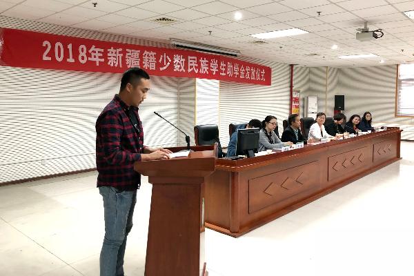 会上三名受助学生代表和内派教师代表分别发言。来自哈萨克族的临床1730班学生叶尔加那提﹒都曼别克怀着激动和喜悦的心情讲述了自己作为一名少数民族学生的成长故事,衷心地感谢国家和学校对新疆少数民族学生的关爱,并代表所有受助学生表示一定要将这份关爱化为学习的动力,将来为家乡医疗卫生事业发展奉献自己的青春和智慧。口本1613班的维吾尔族学生古丽排日﹒艾买尔江说,没有国就没有家,没有中国共产党和伟大祖国,就没有维吾尔族今天的发展和繁荣,就没有维吾尔族人民的幸福生活,更没有她个人的成长和进步,作为当代大学生和青年人的代表,她更要坚定捍卫新疆社会稳定和长久治安。公卫1417班维吾尔族学生艾科拜尔﹒尼扎木说他刚来学校时中文不好学习比较吃力,通过近几年老师和同学们的帮助和自己的不懈努力,现在已经成长为全校新疆籍少数民族负责人助理和预备共产党员。