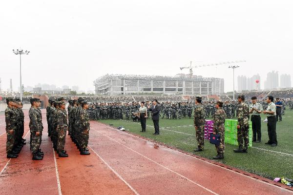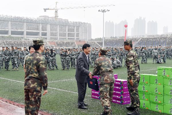 (武装部)2017年9月4日下午17:00,学校党委书记范兵对承担我校2017级新生军训的承训部队--中国人民解放军火箭军工程大学44名教官进行慰问。党政办主任李庆民、学工部部长、武装部部长靳红樱、学工部副部长、团委书记王燕陪同前往军训场地。