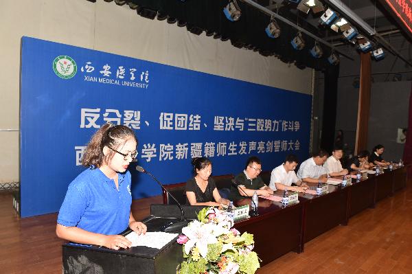 新疆籍少数民族学生代表临床医学院临本1621班卡德燕·阿布都克热木同学及医学技术系影本1314班 艾尼瓦尔·米吉提同学分别结合自身成长经历和工作学习生活,作了表态发言。他们表达了没有党的关怀就没有新疆人民的幸福生活,当代大学生要坚决同三股势力作斗争,刻苦学习,努力工作,用实际行动捍卫民族团结和社会稳定的坚定信心。