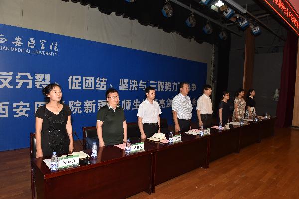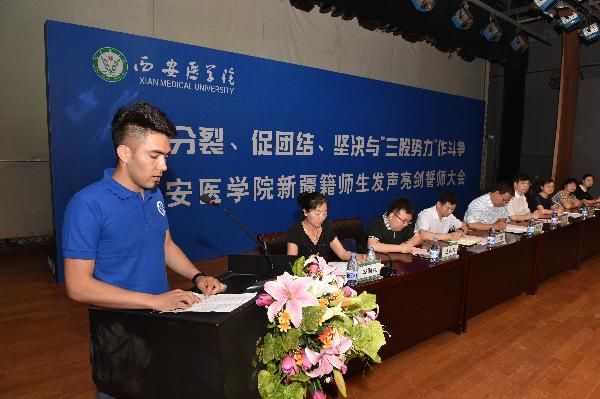 新疆内派教师阿不力米提.吐尔逊老师带领大家宣誓:“坚决拥护中国共产党的领导,坚决响应自治区党委和陕西省委的号召,维护新疆团结,反对民族分裂,自觉同“三股势力”作斗争,自觉抵御宗教极端思想的渗透,崇尚科学、远离宗教,刻苦学习,努力工作,以优异的成绩报效祖国,建设美丽的家乡”。铿锵有力、振奋人心的誓言,在学术报告厅里回荡。