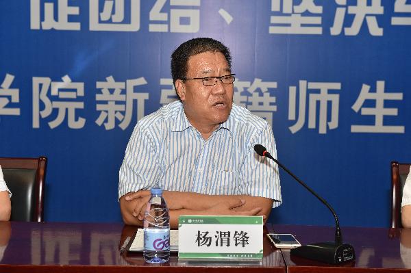 新疆驻陕西工作组党委书记、组长、陕西省委政法委副书记杨渭锋出席大会并讲话。他表示:今天的大会准备充分、部署得力、行动迅速、效果明显。这充分体现了学校党委的高度重视,也反映出学校在少数民族学生教育管理工作中的高效管理和勤奋务实。希望同学们能认真践行所做的承诺,远离宗教极端思想的侵蚀,擦亮眼睛,主动发声亮剑,勇敢地向“三股势力”宣战,时刻以维护新疆稳定、维护陕西省稳定、维护国家安全稳定大局为重,各民族同学要向石榴籽一样紧紧地抱在一起,积极维护民族团结,努力学习,学到真实本领更好的建设美丽的新疆。