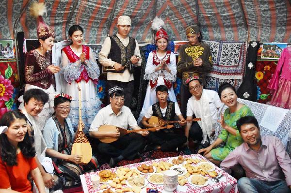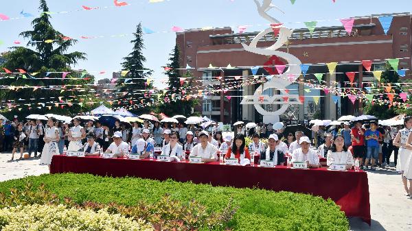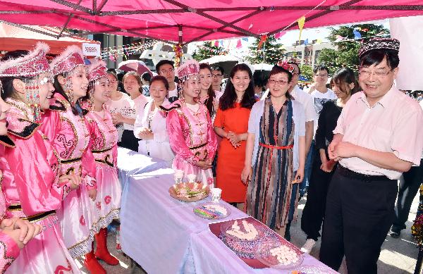 在民族文化展区,各民族学生热情为广大师生介绍本民族的传统文化,讲解家乡的变化,展示各种精美的民族服饰和特色美食。维吾尔族的烤肉和抓饭、蒙古族的马奶酒、哈萨克族的酸奶酪、藏族的酥油茶、苗族的绵菜粑、彝族的糯米粑粑、回族的盖碗茶……藏族学生向各位领导和老师敬献了哈达,表达了同学们对老师悉心培养和无微不至关怀的深深谢意。在哈萨克族帐篷里,校领导与同学们围坐在一起,喝着香醇浓郁的奶茶,弹起了冬不拉,一起感受农牧游民的幸福美好生活。身着各民族服饰的同学们跳起了欢快的舞蹈,各位领导和每一位师生边走边看、驻足品尝、流连忘返。