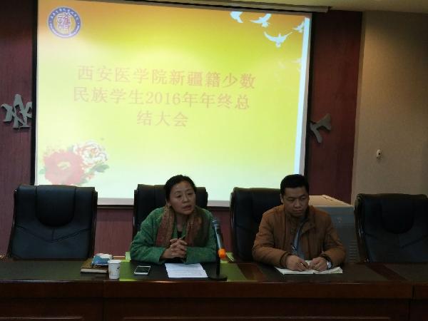 安老师首先对2016年我校新疆籍少数民族学生教育管理工作进行了总结。她从同学们的思想行为表现、学习状态及成绩、遵章守纪情况、大团体意识和集体荣誉感几方面入手,对同学们所取得的成绩给予肯定,指出存在的问题和不足,希望新的一年里,全体同学能不断提高自身素养,严格要求自己,刻苦学习,改正不足,争取更大的进步!
