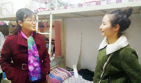 随后,熊书记一行前往2号、7号、8号公寓楼。她逐一查看了宿舍的卫生情况,房间的供暖状况,重点查看了有新疆籍学生的相关宿舍。每到一间宿舍,她不时用手摸摸暖气包的温度,询问同学们在生活、学习中还有什么困难,提示大家要注意用电安全,鼓励同学们要努力学习,以良好的状态迎接期末考试,同学们倍受鼓舞,激动万分。