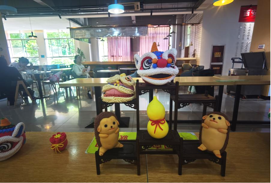 刘淑梅为学生手把手教授,现场学生积极参与互动,和面、发酵、揉面、捏形、蒸制、着色、插花......搓团捻擀剪、切扎按捏卷,一番复杂的工序之后,20件精美的“醒狮”花馍作品呈现在众人眼前。