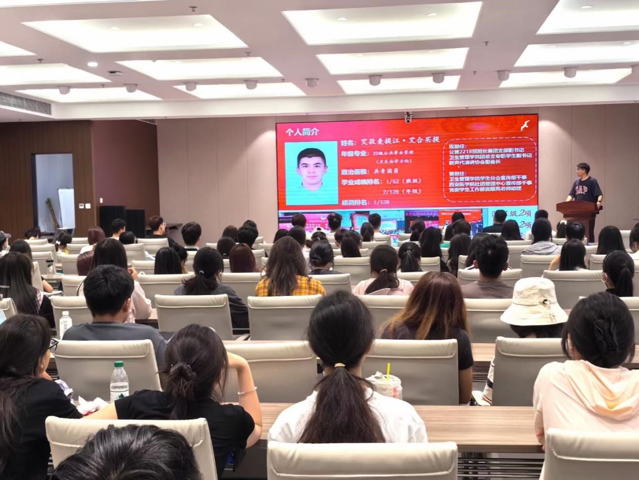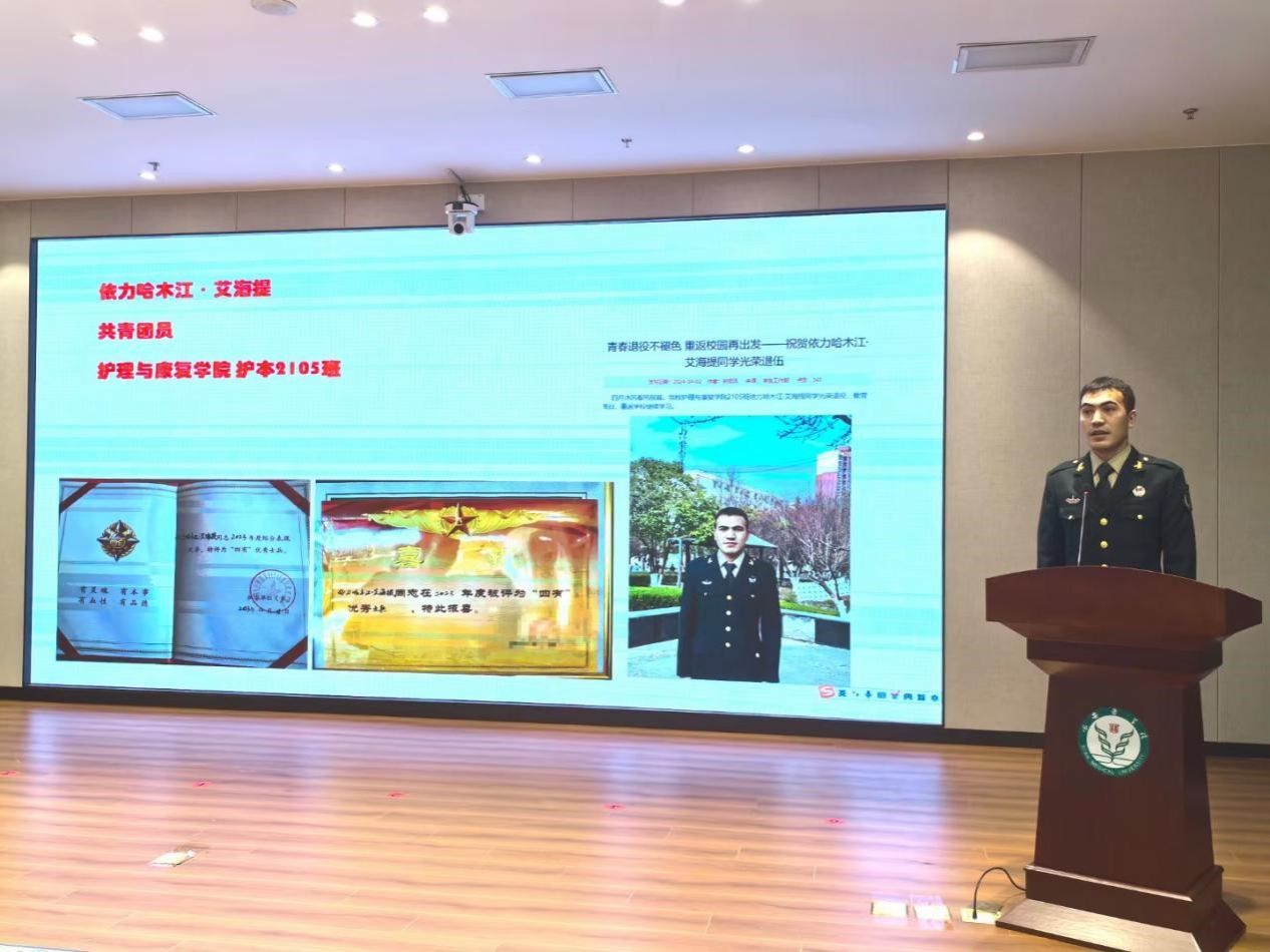 少数民族学生优秀代表,临本1949班米日妮萨·凯才尔、卫管2218班艾孜麦提江·艾合买提、护本2105班依力哈木江·艾海提三位同学逐一上台,从学习专业、民族团结、军旅生涯、志愿服务等方面,向同学们分享了自己在校的成长经历。