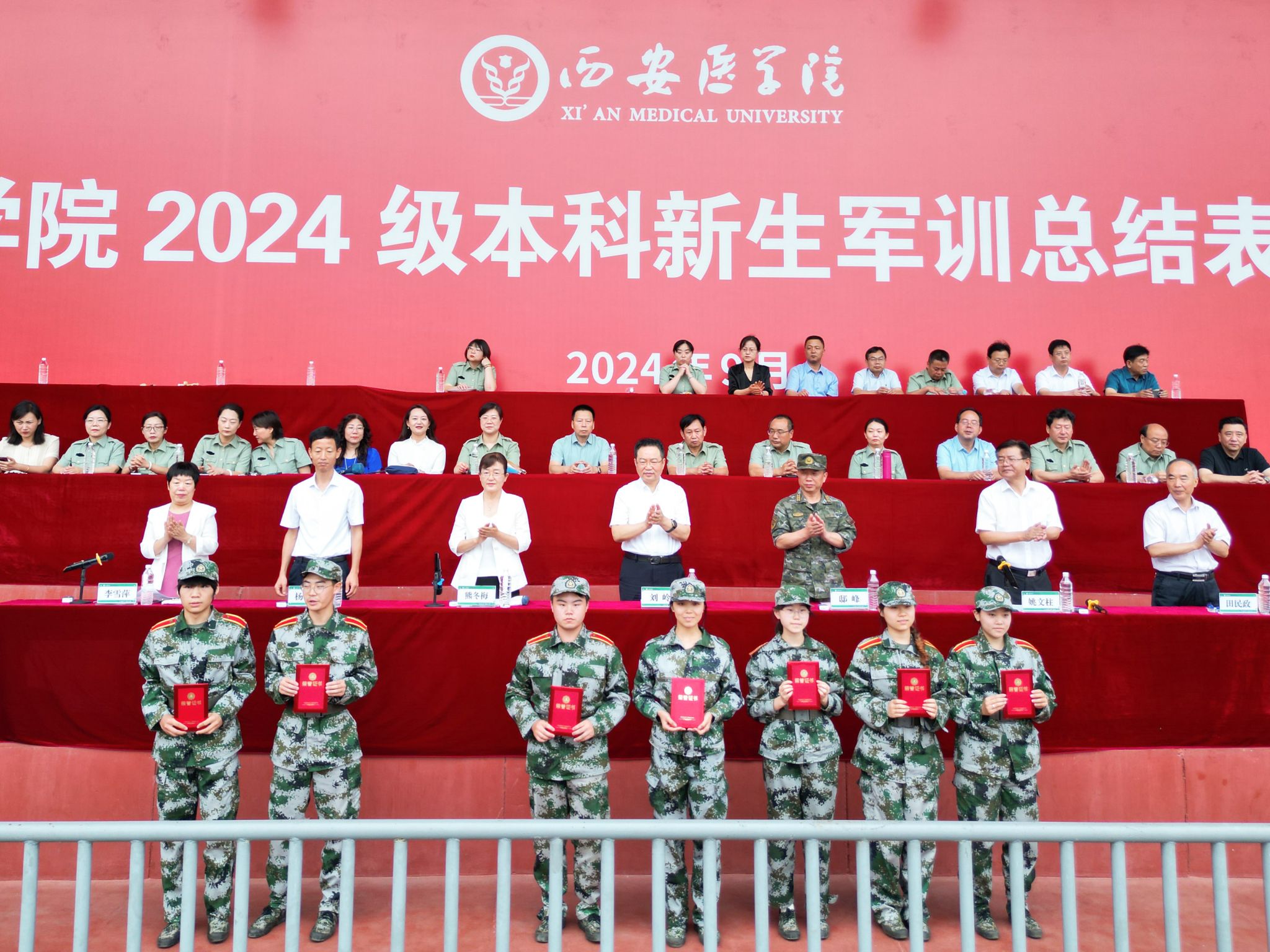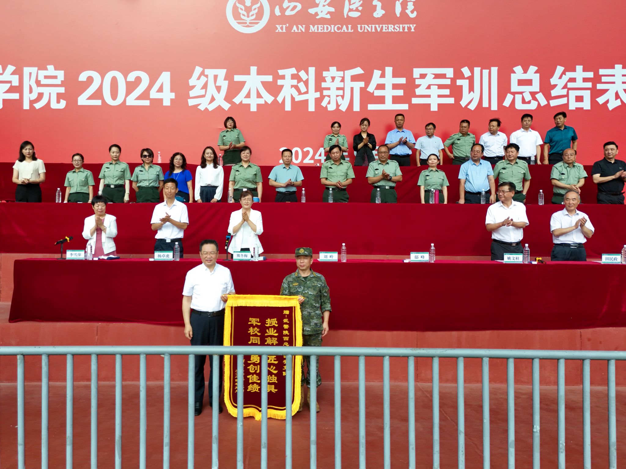 校领导为军训工作先进集体、先进个人代表颁发奖牌及荣誉证书,勉励受到表彰的集体和个人珍惜荣誉、再接再厉、继续发挥带头模范作用,在新的起点上再创佳绩。