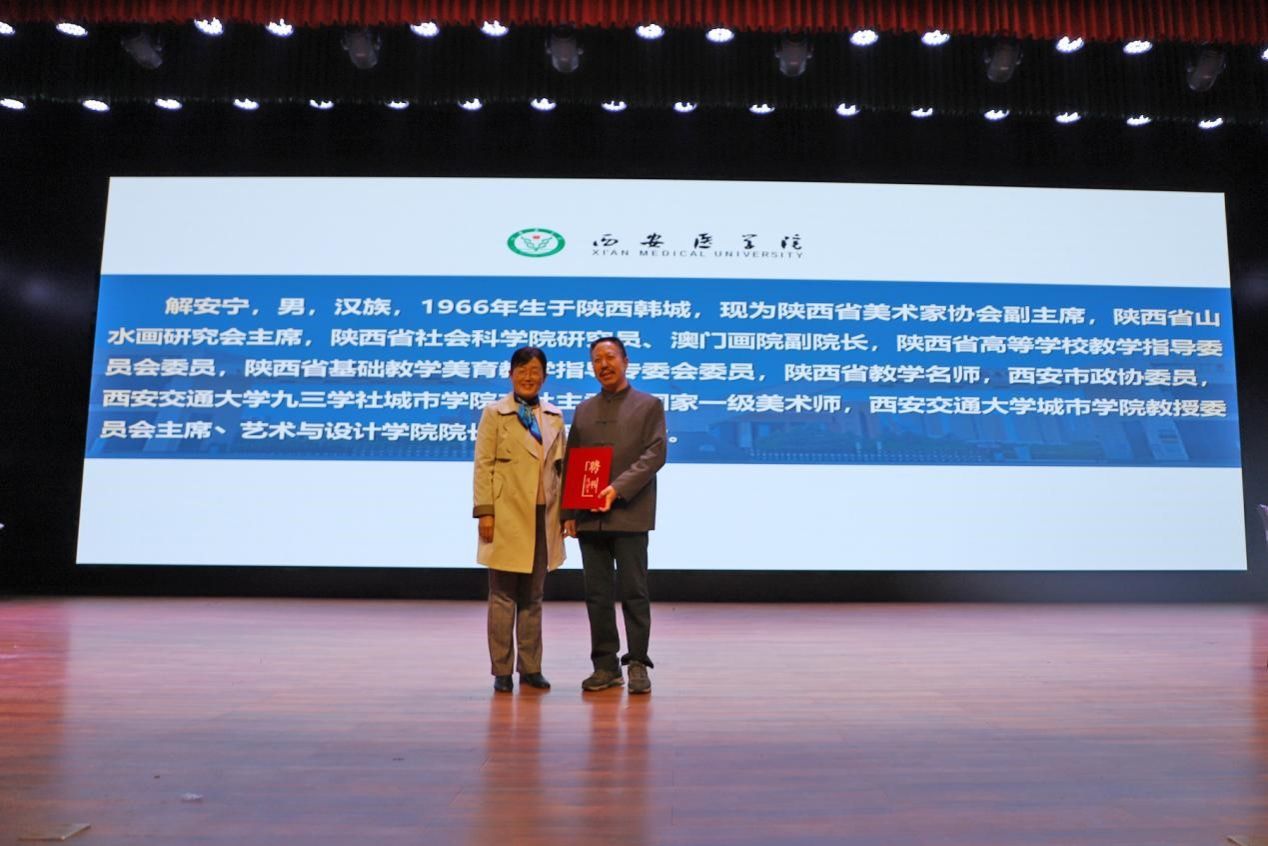 11月7日下午,我省美术家协会副主席、国家一级美术师解安宁教授受聘仪式暨专题报告在未央校区学术报告厅举办。校党委副书记熊冬梅为解安宁颁发“杏林育英”客座教授聘书。党委副书记、纪委书记、监察专员田民政宣读《西安医学院全面加强和改进新时代美育工作实施方案》文件。解安宁教授以“当代大学生美育养成之——中国画鉴赏”为题作报告。学工部部长、学生处处长、武装部部长昝倩主持。