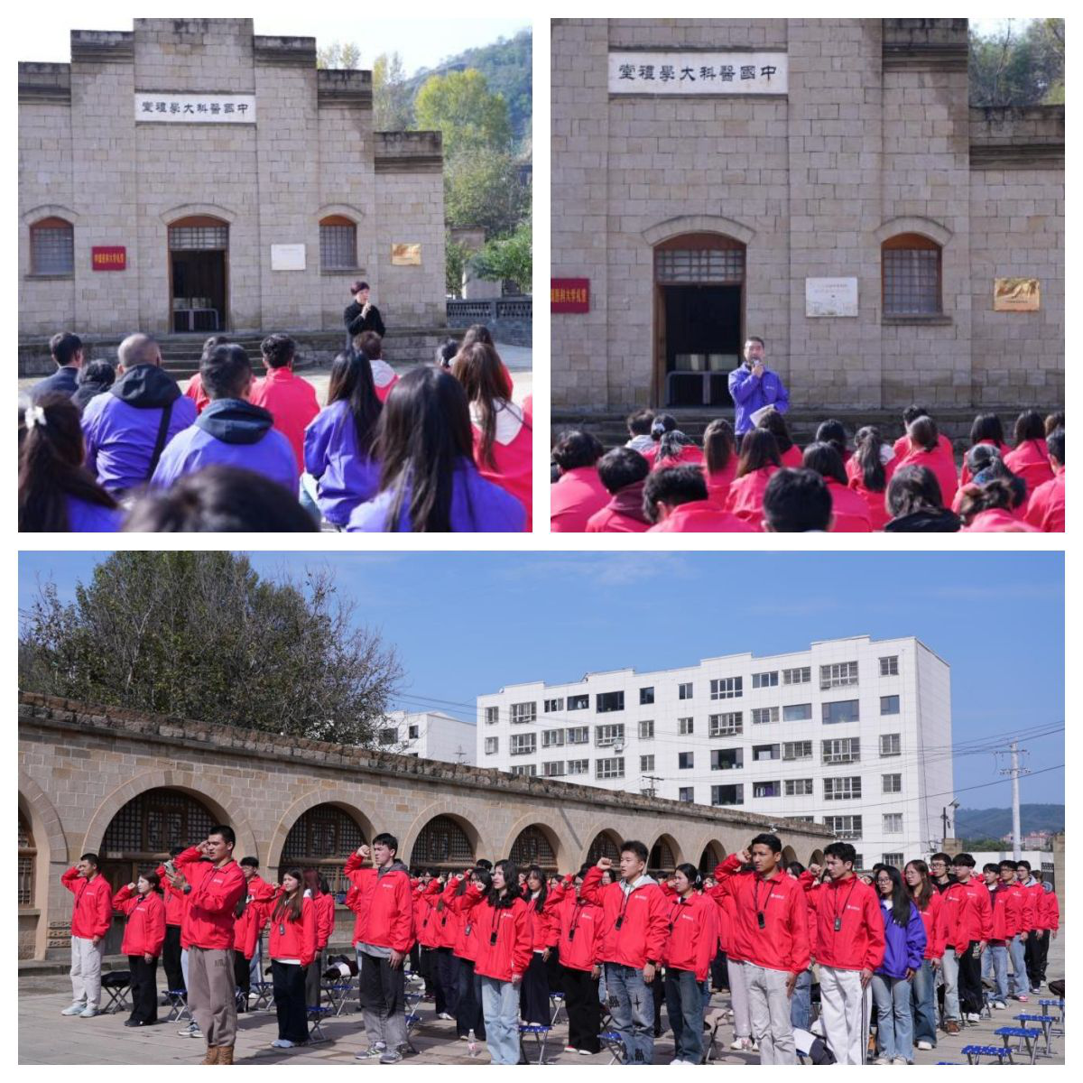 在中国医科大学旧址,一段跨越时空的医学精神传承在此上演。延安大学文学院副教授卜岩为研学团深情讲授了白求恩大夫“毫不利己、专门利人”的动人故事,将国际主义精神与医者大爱深深烙印在每位学子心中。我校马克思主义学院张雨新教授结合学校发展历程,讲述了西医人在不同历史时期坚守初心、服务人民的担当故事,将校史融入党史,让红色基因与医学使命紧密相连。在现场浓厚氛围的感染下,全体学生肃立高举右拳,庄严诵读医学生誓言,铿锵的誓言在革命旧址上空回荡,传递着新时代医学学子继承先辈遗志、守护人民健康的坚定决心。