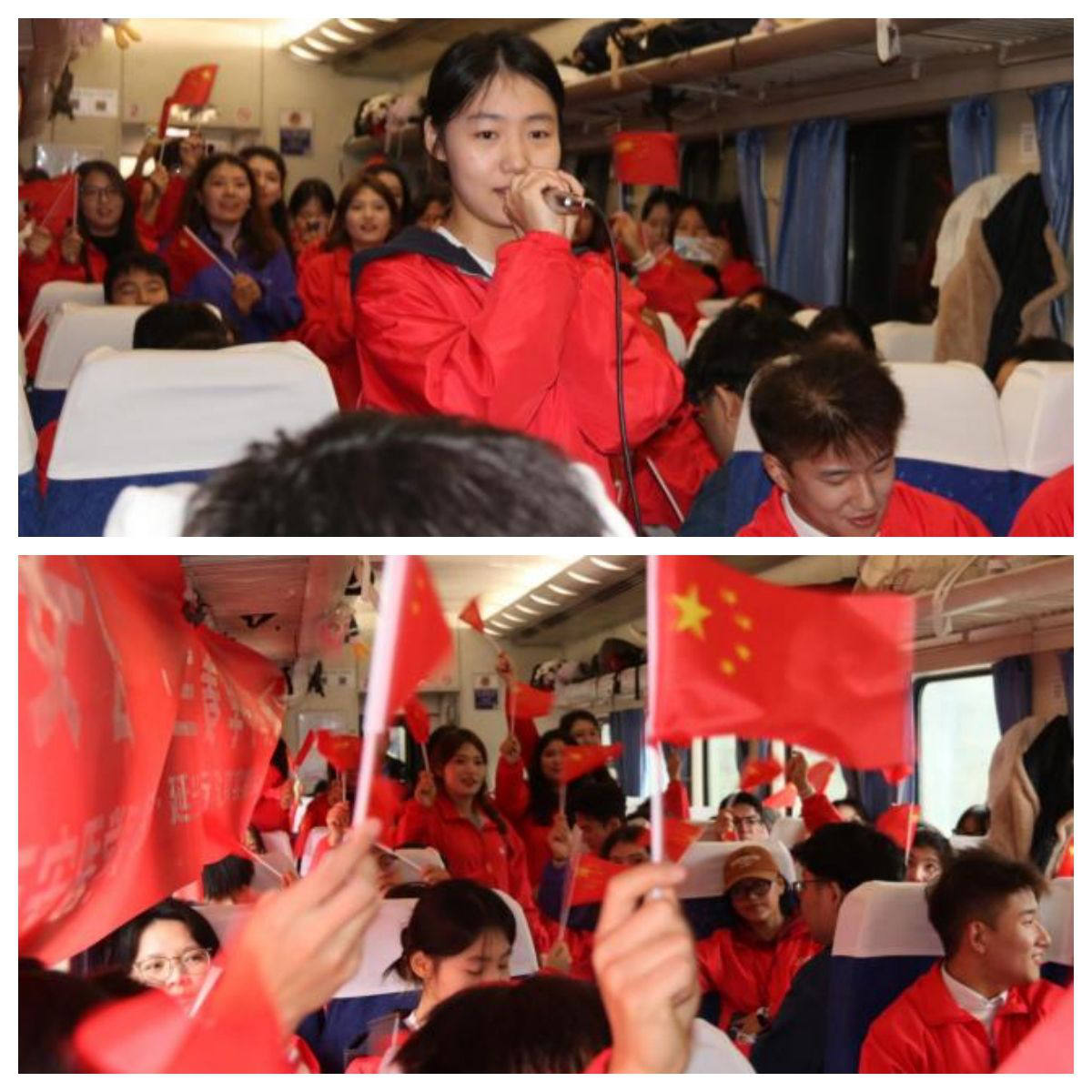 行程中,师生组织开展红歌颂唱,《我和我的祖国》等具有代表性的爱国歌曲旋律在列车中回响,激昂的歌声传递出对祖国的无限热爱与深情祝福,车厢内洋溢着热烈而庄重的氛围,师生共同沉浸在这场别开生面的移动音乐盛宴中。