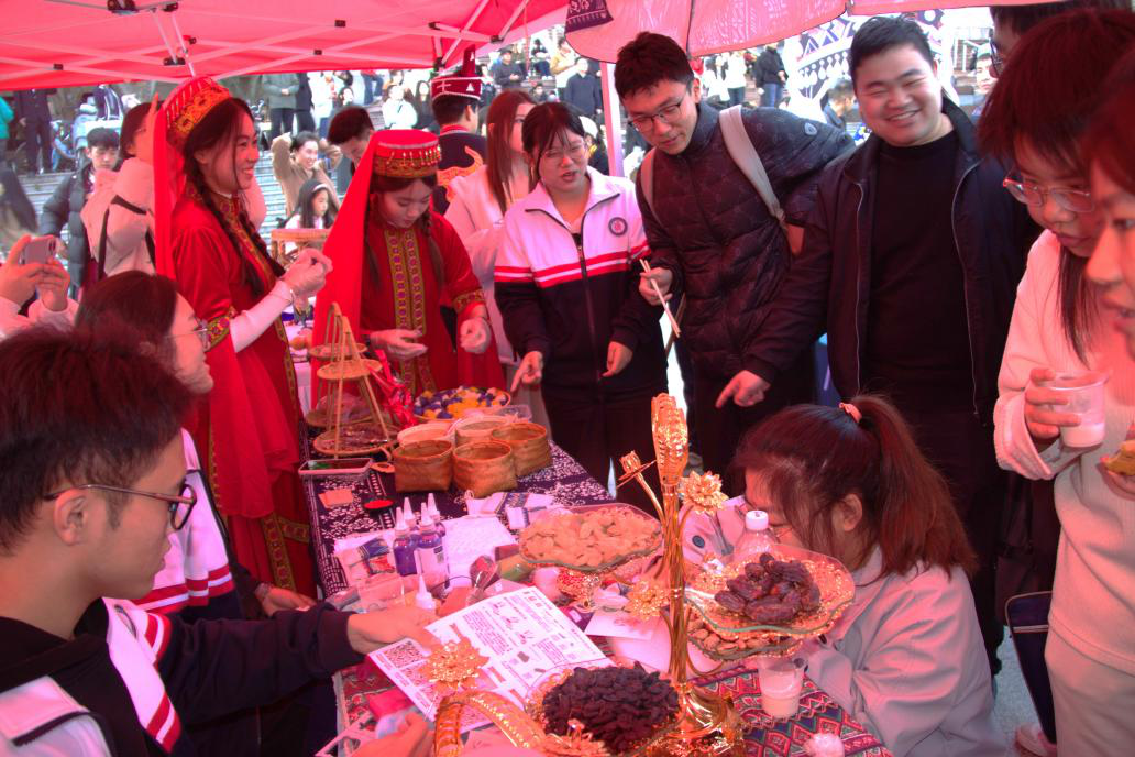 活动现场,我校承办的仡佬族、塔吉克族民族展台的系列作品受到师生的欢迎。护理与康复学院师生精心设计仡佬族、塔吉克族传统文化宣传展板,系统介绍了仡佬族、塔吉克族的历史渊源、风俗习惯和文化特色,为参观者提供了一个了解民族文化的窗口。参观者不仅能在现场体验仡佬族传统印染技艺,还能品尝到塔吉克族的奶茶、切糕、干果等独具特色的传统美食。期间,我校学生还表演了精心准备的民族舞蹈,赢得了现场观众的阵阵掌声。活动现场气氛热烈,上千名参与师生沉浸式体验了各民族多元文化,领略了中华优秀传统文化风采。