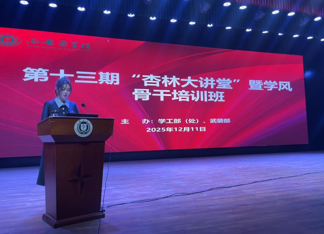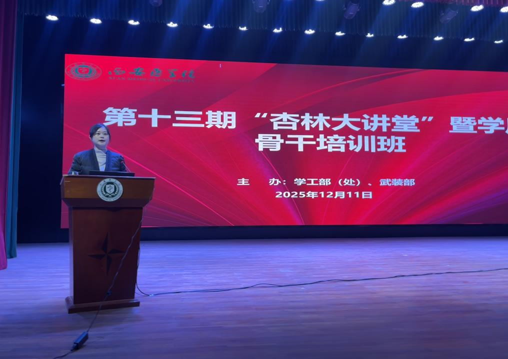 2025年12月11日下午,我校于未央校区学术报告厅举行以“以学风之基 筑医学之才”为主题的第十三期杏林大讲堂暨学风骨干培训班。本次培训由学工部(处)部长、武装部部长昝倩作专题报告。学工部副部长李美玥主持。