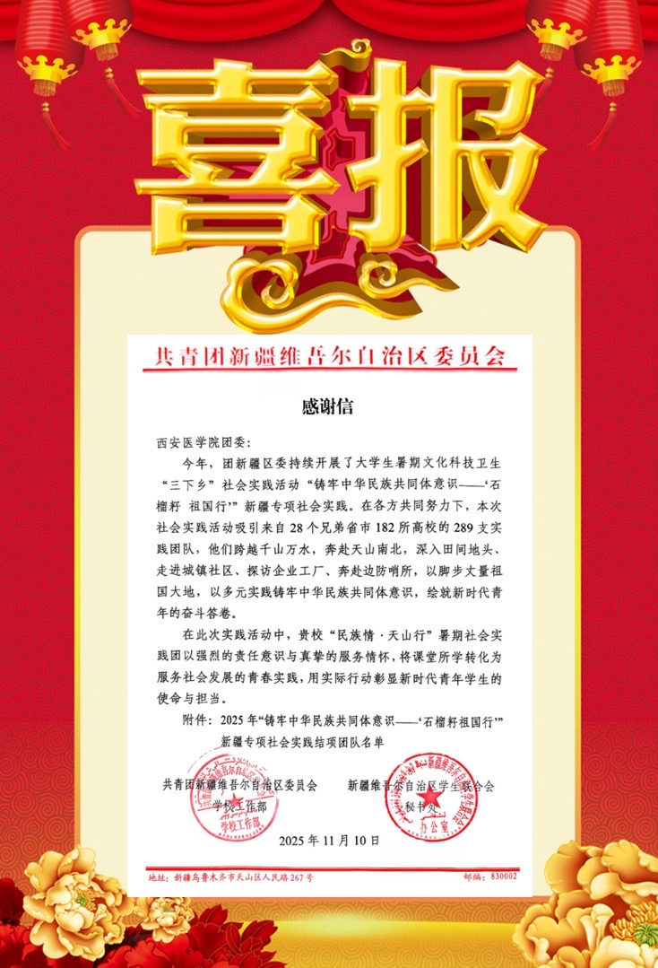 近日,共青团新疆维吾尔自治区委员会向我校发来感谢信,表示:在2025年全国大学生暑期文化科技卫生“三下乡”社会实践活动“铸牢中华民族共同体意识——‘石榴籽 祖国行’”新疆专项社会实践活动中,我校学工部“民族情·天山行”暑期社会实践团队以强烈的责任意识与真挚的服务情怀,将课堂所学转化为服务社会发展的青春实践,用实际行动彰显新时代青年学生的使命与担当。
