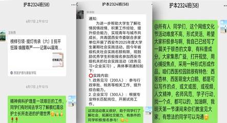 一是锤炼科学素养。导师组内加强交流协作,石莉红老师及时沟通分享有益的学术讲座和培训活动信息,推荐“双创辅导公开课”“中卫护研院”等护理公众号,通过动态学习提醒、个性化辅导提升学术意识和科研能力,在班级内形成“勤思考、爱钻研”的氛围。