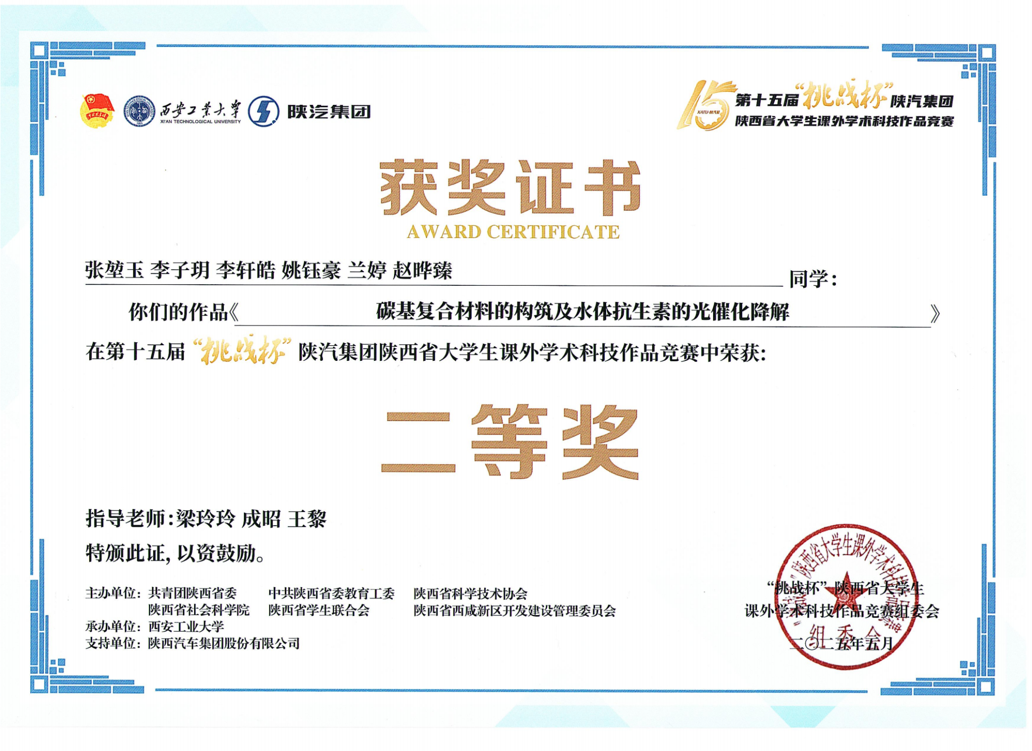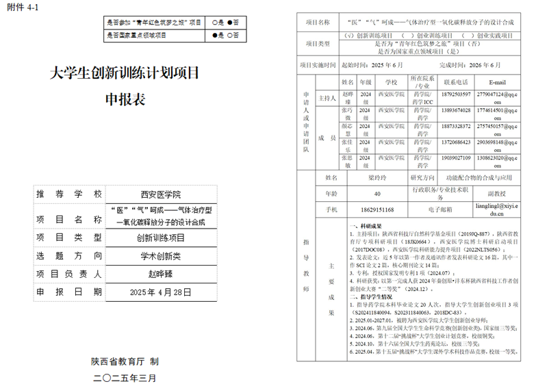 赵晔臻同学进入实验室以来,始终积极投身教师科研工作与各类学科竞赛,其参与角色与能力也逐步进阶,初期以团队成员身份积累实践经验,后续则成长为项目负责人,独立牵头申请项目、组织参赛。作为核心成员参与第十届“挑战杯”陕汽集团大学生课外学术作品竞赛获省赛二等奖;参与全国生命科学竞赛获国家级三等奖;参与中国国际大学生创新大赛校级赛事获校级铜奖;主持申报2025年度大学生创新创业项目《“医”“气”呵成——气体治疗型一氧化碳释放分子的设计合成》,并携该项目参与“互联网+”比赛,展现出扎实的科研素养与出色的组织领导能力。